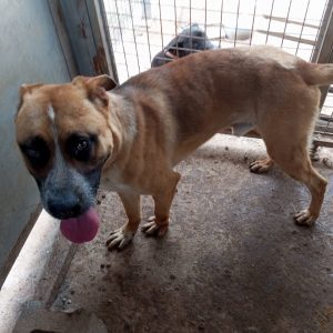 Mestizo marrón , macho , joven , inquieto y algo travieso, le gusta jugar con otros animales.