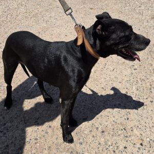 Mestizo de color negro fuego, hembra ,con carácter y muy activa , sociable con personas y otros animales .